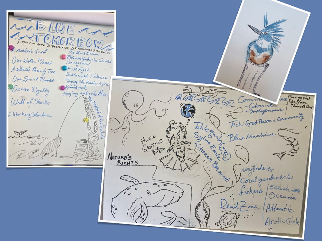 When trying to make sense of a big topic (the ocean is basically the definition of an absurdly big topic) I find that drawing helps me put things in concrete terms and find a story. I love big pads of drawing paper and, more recently, office whiteboards. The bottom photo is from my office at Radcliffe. The photo on the left was taken at Loyola. I liked the kingfisher so much, I made it into a birthday card for my father-in-law.