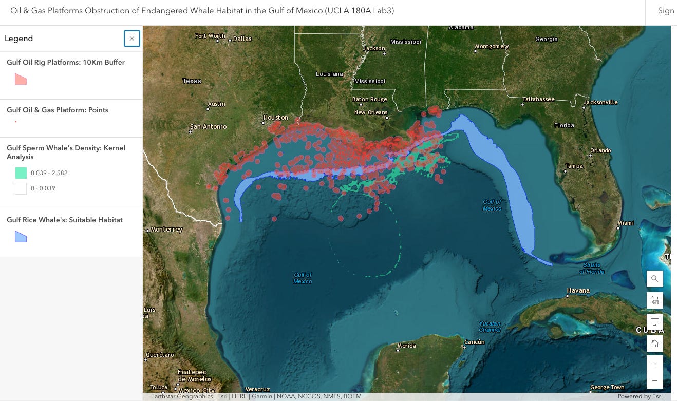 Here’s how the paths of whales and rigs cross. The dots represent oil rig platforms. The blue ribbon is Rice’s whale habitat.
